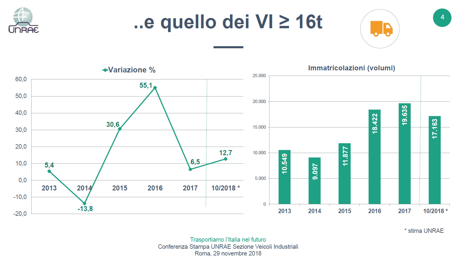 Il titolo della conferenza stampa "Trasportiamo l'Italia nel futuro", svoltasi a Roma lo scorso 29 novembre, vuole sottolineare l’impegno di Unrae per far sì che si creino migliori condizioni allo sviluppo dell’autotrasporto e del mercato dei veicoli industriali. Dal canto suo, l’associazione delle Case Automobilistiche Estere presenti sul mercato italiano ha portato avanti una serie di proposte che puntano proprio al rilancio di questo comparto, perché “Qui - ha chiaramente espresso Franco Fenoglio, presidente Unrae Veicoli Industriali - si sono persi più posti di lavoro che con l'Alitalia, ma nessuno dice nulla”.