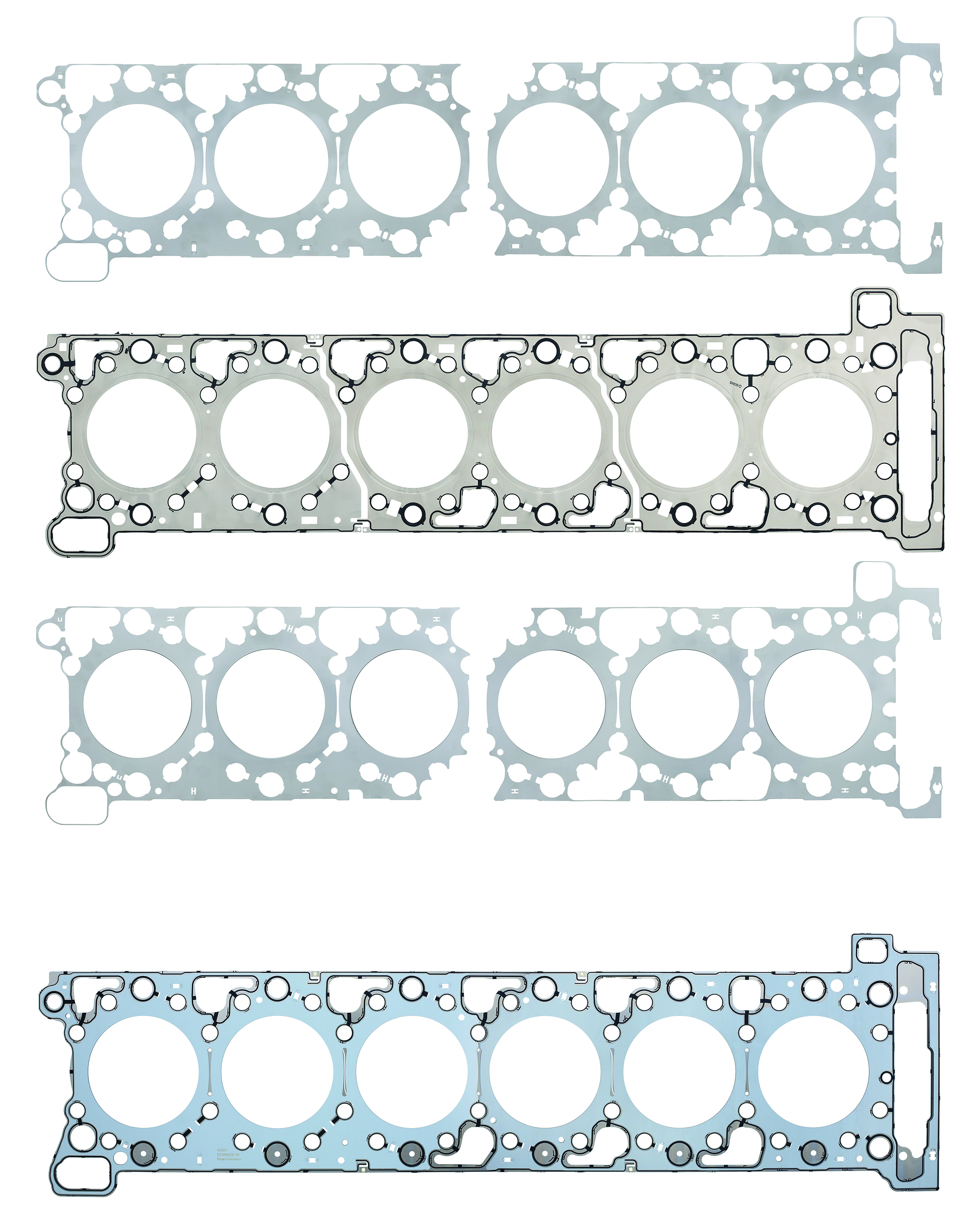 “Il grosso passo successivo nello sviluppo di questa tecnologia fu l’introduzione di un materiale costituito da una lamiera dentellata e un sigillante applicato mediante calandratura, con risultati eccellenti per i motori diesel dei veicoli commerciali” spiegano i tecnici di ElringKlinger. L’ingresso in grande stile nella produzione in serie avvenne nel 1963 per il motore Mercedes Benz OM346/355, che gode ancora oggi di grande popolarità.La realizzazione di motori sempre più potenti e l’introduzione di norme sui gas di scarico stringenti hanno quindi portato allo sviluppo delle guarnizioni in metallo-elastomero, una tecnologia che si è affinata nel corso degli anni e che oggi rappresenta lo standard di riferimento per i motori diesel di grandi dimensioni.