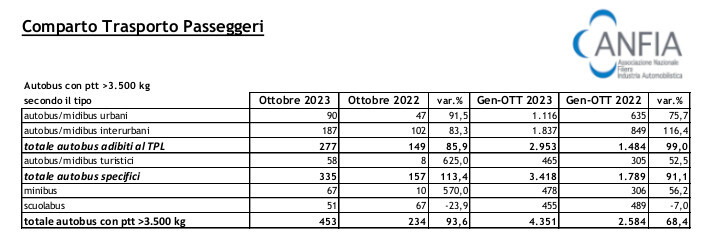 Il mercato degli autobus con ptt superiore a 3.500 kg totalizza ad ottobre 2023 453 nuove unità, con un incremento del 93,6% rispetto ad ottobre 2022.Nel decimo mese dell’anno, si mantengono positivi, con un rialzo a doppia cifra, gli autobus adibiti al TPL (+85,9%), e, con incrementi a tripla cifra, i minibus (+570%) e gli autobus e midibus turistici (+625%). Continua, invece, il calo degli scuolabus (-23,9%).