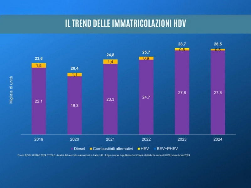A fine 2024, il parco circolante italiano di veicoli commerciali pesanti (noti come heavy commercial vehicles - HCV) ammontava a 752.000 unità, in lento ma costante aumento negli ultimi anni. La motorizzazione è quasi esclusivamente diesel, scelta dalla quasi totalità del parco per l’elevata densità ed efficienza energetica.