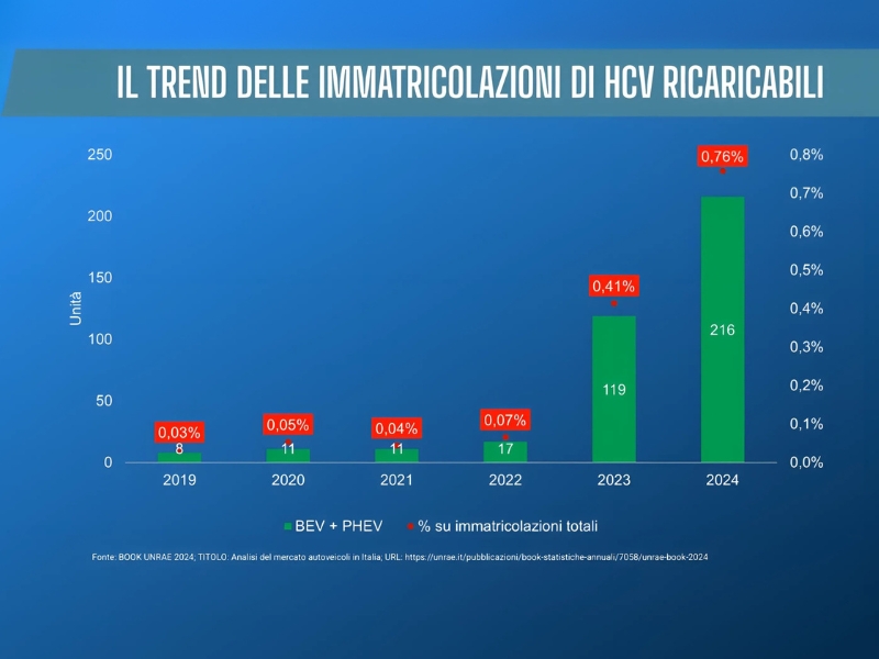 Numeri che, seppur in crescita, restano marginali: le immatricolazioni elettriche hanno infatti rappresentato appena lo 0,76% del mercato HCV italiano nel 2024.