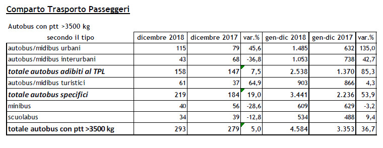 Il mercato degli autobus con ptt superiore a 3.500 kg, nel mese di dicembre registra 293 nuove unità, riportando un incremento del 5%. Nel mese, si registra una crescita per gli autobus adibiti al TPL (+7,5%) e per gli autobus e midibus turistici (+64,9%), mentre registrano una flessione i minibus (-28,6%) e gli scuolabus (-12,8%).Nel 2018, sono stati rilasciati 4.584 libretti di autobus contro i 3.353 del 2017 (+36,7%). Tutti i comparti hanno segno positivo, ad eccezione dei minibus, in calo (-3,2%): +85,3% per gli autobus adibiti al TPL, +4,3% per autobus e midibus turistici e +9,4% per gli scuolabus, rispetto al 2017.