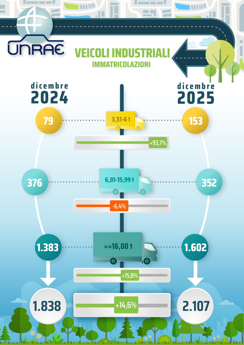 Nel mese di dicembre, il mercato dei veicoli industriali registra una crescita del 14,6%, con 2.107 immatricolazioni rispetto alle 1.838 del 2024.L’analisi per fasce di peso evidenzia andamenti particolarmente dinamici nel segmento dei veicoli leggeri (3,51–6 t), che quasi raddoppiano le immatricolazioni (+93,7%), e nei veicoli pesanti di massa ≥16 t, in crescita del 15,8%.